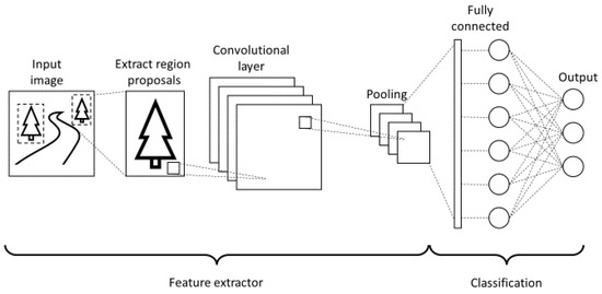 Region-based CNNs (R-CNNs) emerged as an improvement of CNNs. They are able to detect and locate specific objects in an image. The architecture of an R-CNN is similar to that of a CNN. However, an added step of extracting the region containing the object to be detected is included [37]. Figure 4 presents a simplified diagram of an R-CNN [36,37].