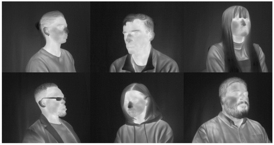 The dataset used in this study is publicly available in [45]. The authors used a FLIR Vue Pro camera to capture thermographic images for the dataset. During image capture, participants looked at a fixed point while the camera was moved to nine equidistant positions, forming a semicircle around the volunteer. Thus, the dataset contained nine thermographic images of the face of each participant. Figure 5 displays examples of photos that comprise the dataset.