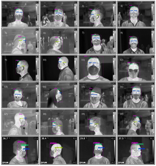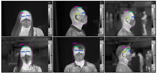 Tests were carried out with photos of six volunteers, different from those present in the training dataset, to evaluate the prediction accuracy of new images. A Testo-885 thermographic camera captured the new images. After transfer learning, the object detector algorithm analyzed these images and detected all ROIs, even for volunteers wearing masks, caps, and with long hair. Figure 7 displays some of these images.