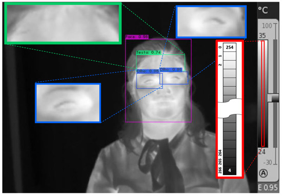 When identifying an object, the YOLO detector provides the coordinates, width, and height of the bounding boxes. This allows delimiting ROIs where the temperature is analyzed. From each ROI, the values of the pixels with the highest temperatures were extracted. Thus, the algorithm discards regions covered by hair, sweat, and fabric, which are generally at lower temperatures. The higher temperatures are shown as the lightest colors in Figure 8.