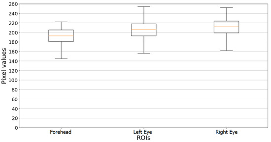 Figure 9 displays a boxplot of the pixel values in each ROI, as depicted in Figure 8. The distribution of the pixels in the forehead region displays lower values than those in the eye regions, indicating that the eyes are at a higher temperature than the forehead.
