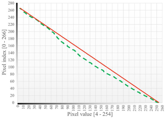 Along the temperature scale, there are 267 pixels, where the first one, pixel zero, has a value of 254. The last pixel of the scale has a value of 4. Figure 10 presents the relationship between the pixel values and their respective positions on the scale as a dashed line (in green). Equation (1) shows a first-order linear proportionality relation, the first-order polynomial, obtained through linear regression, with a coefficient of determination (R2) of 0.9941. The solid line (in red) on the graph shows the behavior of the equation of the straight line that describes this relationship.