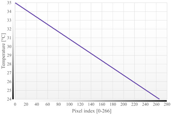 As Equation (1) indicates a first-order linear proportionality between pixel position on the scale and temperature, higher temperatures will produce higher pixel values. Thus, the pixels positioned at the beginning of the scale represent the highest temperatures, and pixels at the end indicate the lowest. Figure 11 depicts the relationship between the pixel positions and the respective temperatures of the scale, as shown in Figure 8. Equation (2) presents a straight line that describes this relationship.