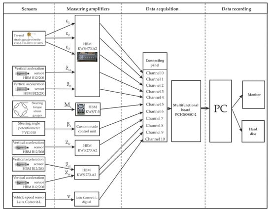 A specific experimental system was designed and then used to identify the interaction between the vehicle steering and suspension systems. It consists of four basic groups of components: sensors, measuring amplifiers, data acquisition system and recording (computer) unit, Figure 1. The following quantities were measured in accordance with the goal of the research: