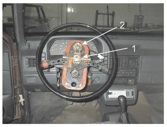 The steering wheel angle was measured using a rotating potentiometer PVG-100 (2) mounted on the small shaft parallel to the steering column. It has a possibility to obtain 9 full revolutions. The potentiometer shaft is connected to the steering wheel column through the pair of gears with a gear ratio of 1:1.883. Rotation of the steering column transfers to the potentiometer shaft through the gears thus enabling the potentiometer to measure indirectly the angular displacement of the steering wheel.