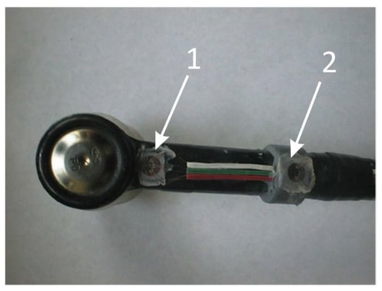 The left tie-rod loads were measured with two miniature strain gauge rosettes (Omega Engineering, type KFG-2-120-D17-11L1M2S), Figure 3. The rosettes have an electric resistance of 120 kΩ and a K-factor of 2.08. The active rosette (1) was placed on a flat surface near the tie-rod joint to measure the tie-rod strain. The compensating rosette (2) was placed on a specially made metal ring. The support ring was not in direct contact with the body of the tie-rod, but through layers of elastic-plastic sealant Syntex 30. The compensating rosette was placed near the measuring rosette. Due to the elastic characteristics of the sealant, the compensating rosette was not exposed to the tie-rod strains. The rosettes were glued to the measuring points according to the rules for surface preparation and gluing of strain gauges. Each of the three strain gauges of the active rosette was connected with the corresponding strain gauge of the passive rosette to form the half-bridge connections, thus making the three input channels of the measuring amplifier.