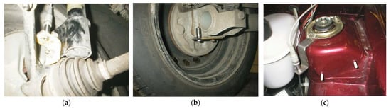 Vertical acceleration sensors: (a) at the centers of the front wheels []; (b) at the centers of the rear wheels []; (c) at the top of the front left shock absorber.