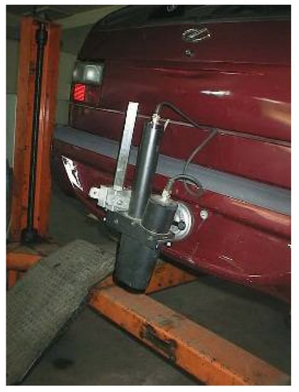 The correlation-optical sensor Leitz Correvit-L shown in Figure 5 was used to measure the vehicle longitudinal speed. The non-contact speed sensor Leitz Correvit L uses spatial frequency velocimetry technology based on illumination of the road surface and imaging of its micro-structure. The reflected light goes through optical grating to a photodiode. The cross-correlation of the road surface image moving over the grating leads to a signal frequency that is proportional to the vehicle velocity, thus the term “correlation-optical sensor”. Measuring range of this sensor is from 3 km·h−1 to 200 km·h−1. It needs a DC power supply in the range from 10 V to 16 V, which was provided by the vehicle main battery and the Leitz Correvit-L2 Digital device.