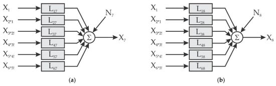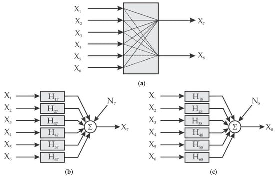 Each input, , affects both outputs  and  through corresponding transfer channels characterized by optimum constant parameter linear frequency response functions, . In this case, the general model can be viewed as a combination of two multiple input/single output models shown in Figure 6b,c. Noise spectra, N7 and N8, shown in Figure 6b,c, correspond to the outputs X7 and X8, respectively, and represent all possible deviations from the linear models due to a small number of inputs, time delays, nonlinearities, statistical errors, non-stationarity, instrument noise, etc.