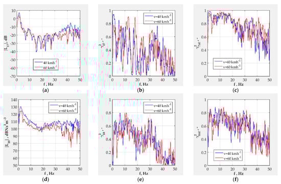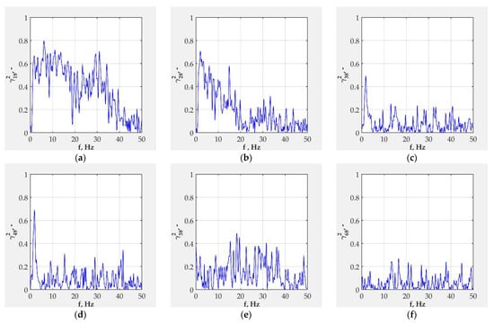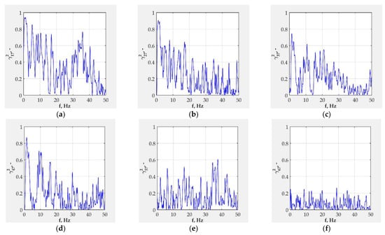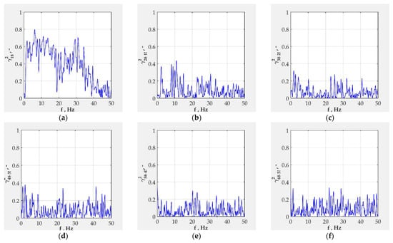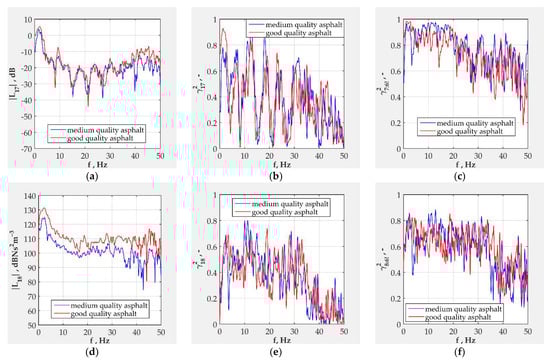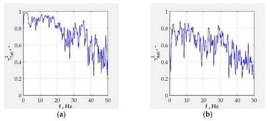 The curve shapes of the ordinary coherence functions and their values for both transfer channels remain the same, regardless of the type of road, Figure 21b,e. The values of the ordinary coherence function for the channel  have large fluctuations. A large variance of the values prevents the drawing of definite conclusions regarding the influence of the road quality.