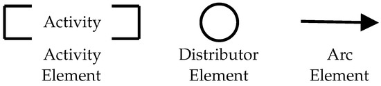 Basic elements of the Production Flow Schema (PFS). The PFS represents the system conceptual description. Arcs connect activity and distributor elements. Activity elements can be refined into a new PFS model or a PN.