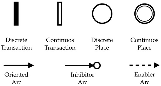 The HPN model was introduced as an extension of the discrete PN model, allowing the manipulation of real numbers in a continuous form, thus allowing to express explicitly the relation between continuous values and discrete values, keeping good modeling characteristics of discrete systems consented in a consecrated way by PN. The HPN is a bipartite graph that is represented with places and transitions. The components of the HPN are classified into discrete/continuous places and discrete/continuous transitions. A nonnegative real number is represented by a continuous place and the firing rate of the continuous transition is given as a function of the places in the HPN model. Figure 2 shows graphical notations of HPN elements [16]. The HPN has inhibitor and enabler arcs; these arcs enable/disable specific activities. The refinement of a model generated using PFS to a model in HPN is done based on the procedure adopted in Villani et al. [20].