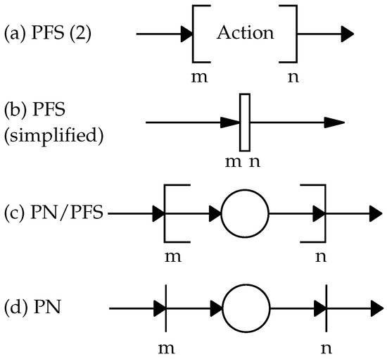 PFS model to PN conversion applying top-down methodology successive refinement. (a) PFS graph with just one activity. (b) Another possible representation for the same activity element. (c) A combined PFS/PN representation. The activity is represented by a discrete place. (d) A pure PN representation.