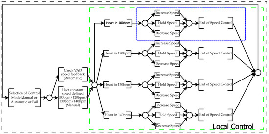 The PFS shown in Figure 7 is refined into a HPN. Figure 8 shows the detailed control of the blue box represented in Figure 7. It has the following dynamics. When the “StartControl” place receives a token, the Speed Control HPN starts and the “LowSpeed” and “HighSpeed” places are monitored. The DAV rotation has a target rotation, considering the specific heart beat. If the speed is not low or high, then the DAV rotation shows the error equals 0, and the speed output remains constant. If the error is different from 0 appears, one of the signals “LowSpeed” or “HighSpeed” has a token. If “LowSpeed” has a token, the speed control token is directed through the enabling arc to the “IncrementSet” place, which has the function of incrementing the controller output to perform the speed adjustment in the driver (local pump control of the DAV) and continues increasing the output until the value is controlled, i.e., the error becomes zero.