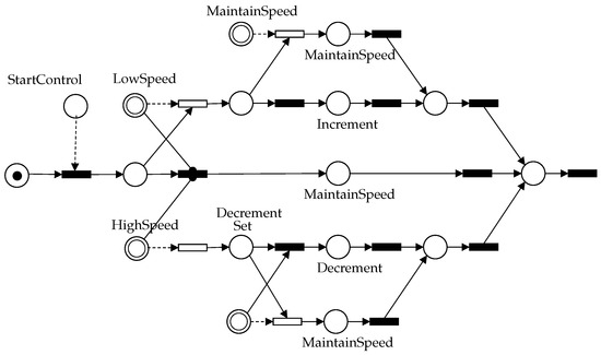Example of a Speed Control HPN obtained from the blue box shown in the PFS model from Figure 7. The system used to model the HPN has horizontal transitions instead of vertical transitions.