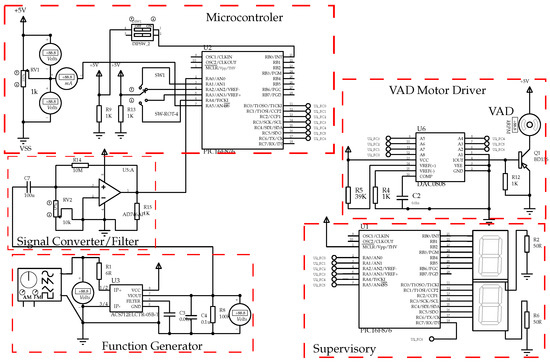 Electronic circuitry developed for the design of the supervisory control. The VAD motor driver controls the blood flow. The VAD control is running at the microcontroller. The function generator creates failures in the system, for example increase the heart beating. The signal converter/filter interfaces the signal to the microcontroller. The supervisory is responsible of the human-machine interface.