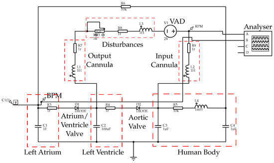 To validate the architecture and the control algorithm, a model of the human cardiovascular system [17] was considered, enabling a virtual simulation of the human cardiovascular system (see Figure 10). It is an electrical equivalent model where the signal generated by the pump rotation control is represented in Figure 10 by the positive and negative poles of the VAD. The electronic parameters are correlated with their mechanical parameters as follows: voltage (V) to pressure (mmHg), capacitance (mF) to elasticity (mL/Pa), electrical resistance (kΩ) to resistance to passage of blood (Pa·s/mL), and inductance (H) to inertia (Pa·s/mL). The elements of each artery are represented, including one or two resistors, an inductor, and a capacitor.