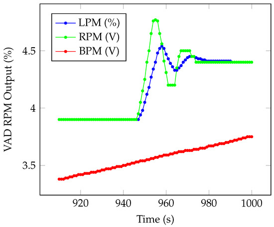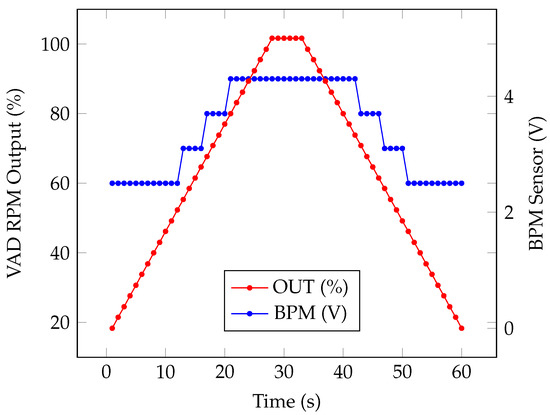With the physical test, it is possible to confirm whether the VAD will effectively help a weakened heart to regain its function as a heart pump in a physical way. This physical simulator serves mainly to verify if there is a tendency of the VAD to make a speed correction if there is a load change in the cardiovascular system, that is, if the VAD system controls a rotation rate to maintain the physiological functions independent of the pump rotation working in a synchronized demand with the natural heart. Using a tachograph and the proper instruments, the VAD state and its respective velocity measurements were performed as presented in Figure 11. Therefore, different reaction curves were generated for the different situations required by the control system. Thus, heart rate variation is applied to analyze how the VAD control system must operate in automatic control mode considering the PN model presented in Figure 8. As show in Figure 11, the system responded according to the proposed control model. The red line shows the simulated heart rate starting at zero beats per minute (bpm) and increasing the value to the maximum bpm value that a patient may present (in this case, 200 bpm was considered), then maintaining stability at the upper level and after decreasing the value again until 0 bpm. With this simulation, it is possible to observe how the control should react considering the whole range of flow control considering the bpm patient range. The blue line shows the pump rotation output sent from the supervisory system to the local control, where the change in speed (0–3000 RPM) as a function of heartbeat (bpm) is observed by the control. The green line indicates the blood flow (0–5 LPM), considering the local control of the pump as shown in Figure 12.