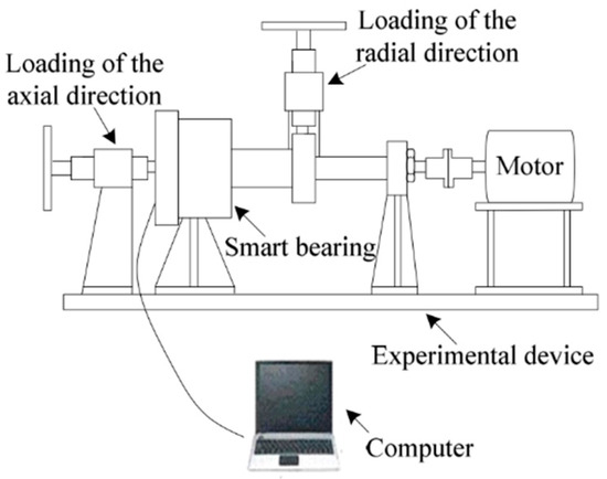 Recently, Martin et al. [23,24] presented a quite novel smart bearing approach, in which the variation of electric impedance of the bearing is measured via an external electronic circuit and is used to identify the load applied and the angular speed. Some experimental results were obtained using a custom-built test rig, that allows testing four small-size bearings simultaneously, at a rotational speed up to 8000 rpm, with loads up to 40 kN per bearing, both in the radial and axial directions, independently. The vertical radial load is applied by a hydraulic actuator, via the two middle rolling bearings, while the two outer ones support the shaft and transmit actions to the platform.