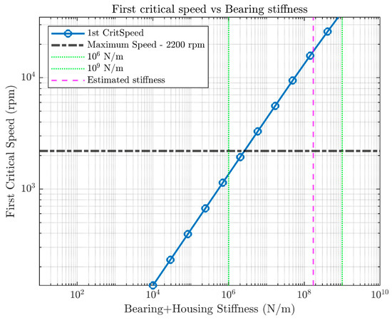 As is known in the literature, a precise estimation of bearing stiffness is difficult, because of a number of uncertainties related to its calculation. Therefore, a stiffness variation has even been considered to investigate the effect of total compliance of the subsystem composed of the bearing and box upon the prediction of critical speeds. Figure 8 demonstrates that a wide range of variation corresponding to a couple of orders of magnitude in stiffness estimation would be necessary to bring the first critical speed within the system operational range of spin speed.