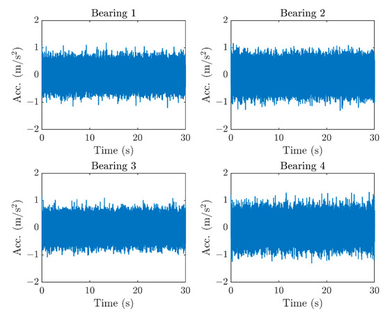 Vibration signals have been extracted using the SKF CMSS 2200T sensors for the test conditions described in Table 2. The sensors have been mounted on the adapters of the four test bearings, by means of threaded connections. Then, the signals have been acquired through the DAQ system and then digitally sampled at 20,480 Hz with AC coupling, which remove the offset DC component of the voltage used to energize the piezoelectric accelerometers from the acquisition. Signal pre-processing has been carried out both in the Test.Lab® and MATLAB® environments. Namely, a sixth-order Butterworth filter with 10,200 Hz cutoff frequency has been initially applied. Despite the use of shielded cables, some spurious frequencies affected the signals, because of electromagnetic noise. Therefore, some digital filters have been properly designed, to improve the signal-to-noise ratio (SNR). Figure 11 shows the four signals acquired for the nominal speed of 331 rpm with 62.4 kN of radial load.