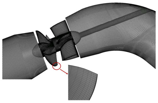 In order to ensure the computational accuracy and convergence of the grid model, the computational domain was divided into structural grids [22,23,24]. ICEM was used to generate the grid of the inlet passage, impeller and outlet passage, and TuboGrid was used to generate the grid of the guide vane, as shown in Figure 2. Local mesh encryption was carried out on the wall surface around the blade and the rim clearance area to ensure that the wall Y+ value met the solution requirements of the turbulence model [25]. In order to ensure the accuracy of the calculation, a total of 15 layers of grids were divided at the blade tip clearance. The number of grid nodes of the inlet passage, guide vane and outlet passage was 1 million, 1.2 million and 1.4 million, respectively, and the number of grid nodes of the impeller under the four tip clearance schemes was controlled at approximately 1.8 million.