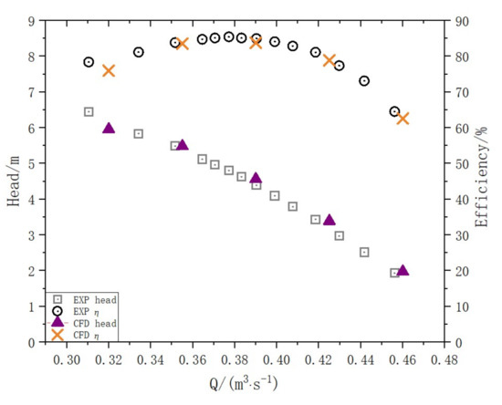 Figure 3 shows the test bench of axial-flow pump. In order to verify the feasibility of the model simulation, the external characteristics of the model pump simulation calculation were compared with the test results of the test bench of axial-flow pump. The flow rate was measured by a cologne intelligent electromagnetic flowmeter, the measurement uncertainty of which was ±0.2%; the head was measured by the YOKOGAWA EJA intelligent differential pressure transmitter, the measurement uncertainty of which was ±0.1%; torque speed was measured by the NJL2/500 Nm intelligent torque speed sensor, the measurement uncertainty of which was ±0.1%. Figure 4 shows the comparison between the experimental results and numerical calculation results of the model pump under different flow rates. The trend of CFD numerical calculation results is the same as that of the test results. The simulated operating efficiency of the axial-flow pump was slightly lower than the experimental value, and the error under the condition of a small flow rate was greater than that under the condition of a large flow rate, and the maximum relative error was 3.1%. The simulated head of the axial-flow pump was slightly lower than the test value under the condition of a small flow, and slightly higher than the test value under the condition of the design flow and large flow, and the maximum relative error was 2.1%. In conclusion, the error between the simulation results and the test results is small, and the reliability of the calculation results is good.