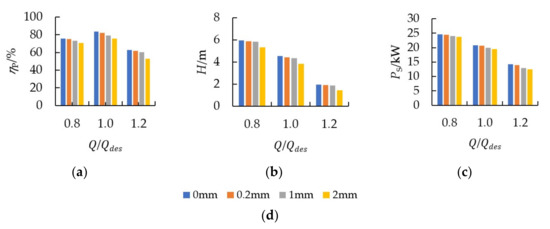 Comparison of (a) efficiency; (b) head; (c) shaft power under different tip clearances in pump condition; (d) Legend.