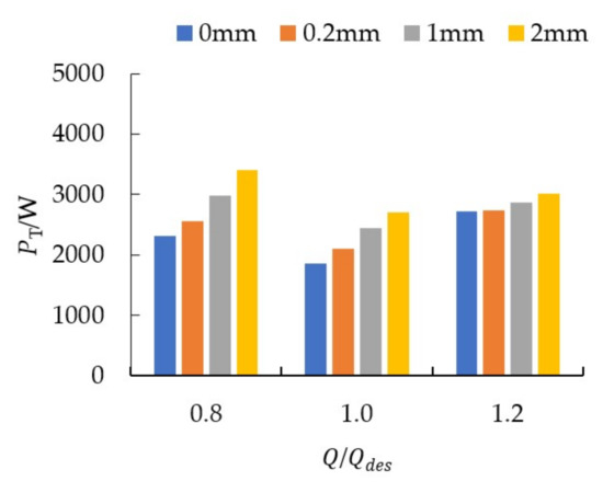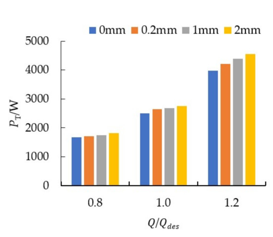 Figure 7 shows the influence of tip clearance on total dissipation under the axial-flow pump condition. In all flow rate conditions, the total dissipation increased with the increase in tip clearance. With the increase in flow rate, the influence of tip clearance change on total dissipation decreased. Under the 0.8 condition, the total dissipation increased by 47.7%; under the 1.0 condition, the total dissipation increased by 45.0%; under the 1.2 condition, the total dissipation increased by 11.2%.