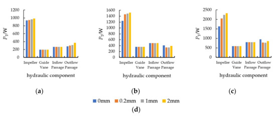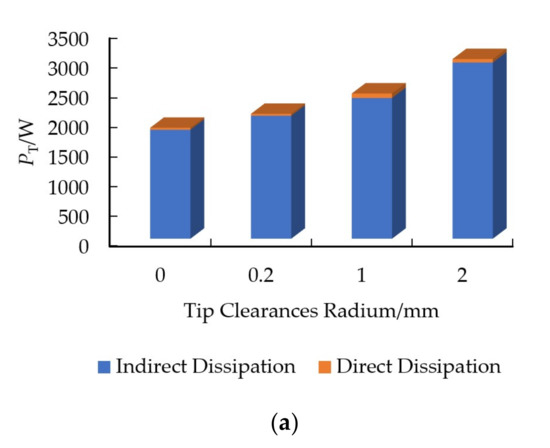 Therefore, a smaller tip clearance should be selected when the pump condition is the main condition; however, a larger tip clearance can be selected when the turbine condition is the main condition. The study result shows the relationship between blade tip clearance and dissipation loss in the pump and its spatial distribution under both pump and turbine conditions. This provides suggestions for the optimization of the axial-flow pump as a turbine, to find suitable tip clearance in the axial-flow pump as a turbine, and provides a reference for solving the problems of large vibration and noise, low operating efficiency caused by clearance that is too large, and manufacturing difficulty caused by clearance that is too small.