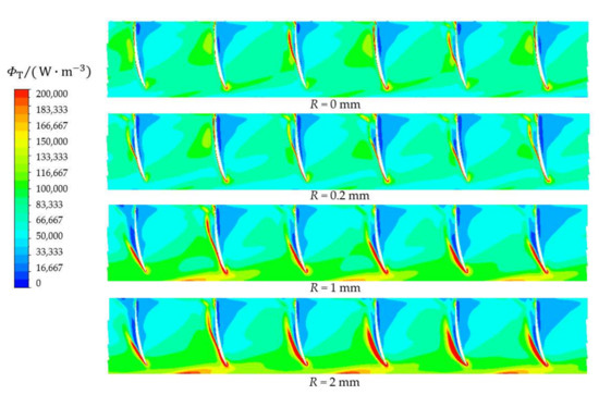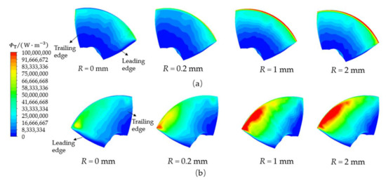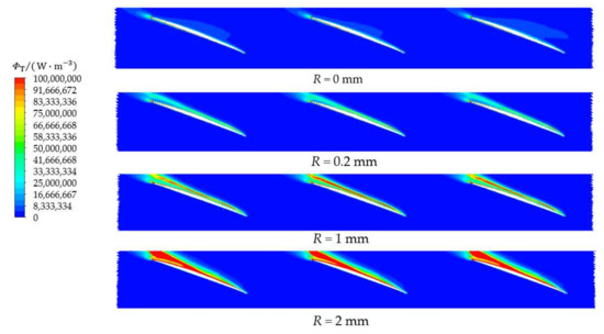 Figure 17 shows the distribution of the total dissipation rate on the cylindrical section of the guide vane under different tip clearance schemes and the pump design flow rate condition (). The high dissipation area inside the guide vane was the suction side and the inlet of the guide vane, where the velocity gradient was large, leading to the generation of high dissipation. The high dissipation area at the suction side was caused by the impact of backflow; the velocity gradient near the inlet of guide vane was large, which also resulted in high entropy production.