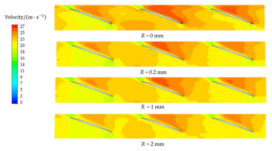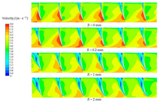 Figure 14 shows the cloud diagram of velocity distribution on the cylindrical section of the impeller under different tip clearance schemes and the pump design flow rate condition (). The flow velocity inside the impeller decreased from the impeller inlet to the impeller outlet, and as a result of the existence of the blade tip clearance, part of the fluid through the blade tip clearance produced return loss and leakage caused by impeller import flow velocity. The bigger the tip clearance, the greater the reflux and leakage phenomena; therefore, the increase in tip clearance speed reduced the impeller inlet from the front.