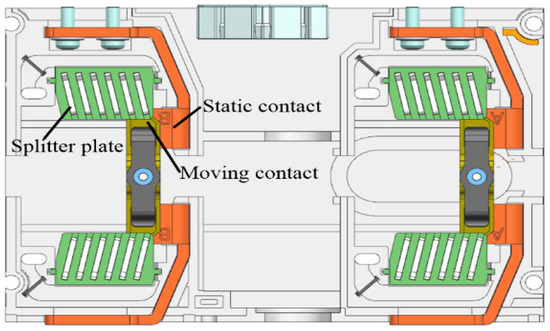- It can be seen from the arc evolution characteristics that the lower utilization rate of splitter plates leads to lower arc voltage, which makes it difficult to extinguish the DC arc. Therefore, the dynamic and static contact structure will be redesigned and the break length will be increased in order to realize the interruption of the DC arc.
