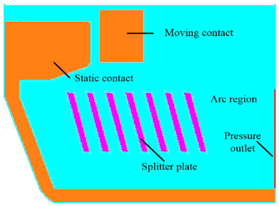 The parts of the splitter plates are used to cut the arc when the arc enters the splitter plate region, as shown in Figure 8. The splitter plates on both sides are not effectively used. On the one hand, the distance is small. On the other hand, the airflow is obstructed by static contact. These hinder the increase in arc voltage and extinguishing of the DC arc. The arc current and arc voltage were also calculated, and are shown in Figure 11 and Figure 12.