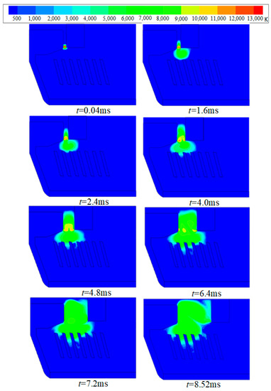 It can be seen from the arc temperature distribution that the arc evolution process can be divided into the following stages: (1) The arc column spreads and elongates with the movement of the moving contact; (2) The arc column is squeezed by the splitter plate; (3) The arc enters the splitter plate region and the arc column is elongated; (4) The arc is cut by the splitter plate and short arcs are formed.
