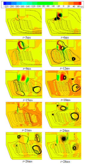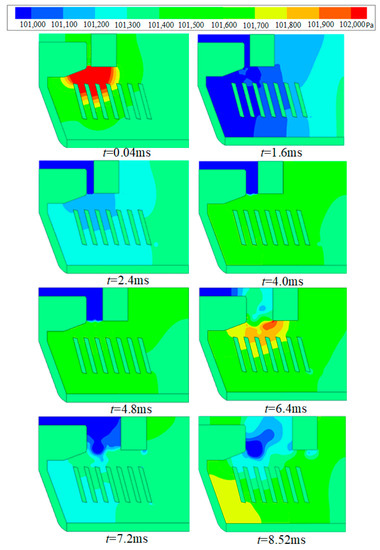 The arc moves to the contact region, especially at t = 2.4 ms and t = 4.8 ms, as shown in Figure 3. The main reason for this is that the pressure near the splitter plate region is higher than the contact region as shown in Figure 4. In addition, the air vortex is formed in the splitter plate region as shown in Figure 5, which leads to the stagnation of the arc. It is not conducive to the cooling of the arc and the increase in the arc voltage. This means that it is difficult for the arc-extinguishing chamber structure to improve the breaking capacity of the disconnector.