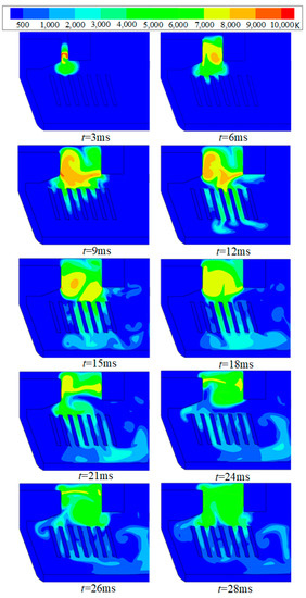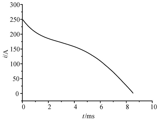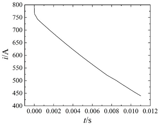 In order to further analyze the interruption characteristics of the arc-extinguishing chamber to the DC high current, the paper calculated the arc motion characteristics at DC 800 A. The time constant was 15 ms. The equivalent resistance and inductance of the circuit were 0.9375 Ω and 14.0625 mH, respectively. The temperature distribution and arc current are shown in Figure 13 and Figure 14.