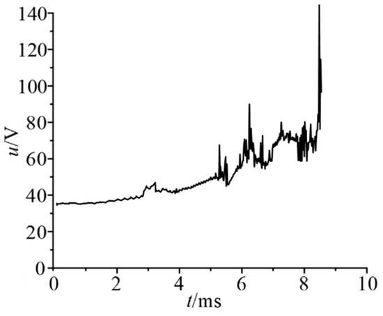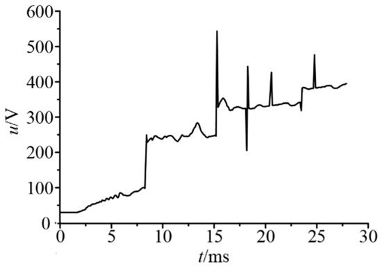 The arc voltage has a sudden increase at about 9 ms, mainly because the arc enters the splitter plate and is cut by the splitter plate. The near-electrode voltage drop increases. The arc voltage increases by about 120 V. This is because the arc column is effectively cut by four splitter plates, thus increasing to four pairs of near-electrode voltage drops (each pair of near-electrode voltage drops is about 30 V). This result can also be seen from Figure 8. The fluctuation in the value of the arc voltage is mainly due to the phenomenon that the arc exits the splitter plate after the arc enters the splitter plate. This is not positive for the extinguishment of the high voltage DC arc.