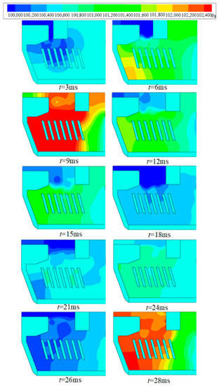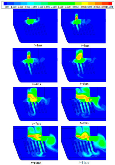 The temperature, pressure, and velocity distribution were obtained. They are shown in Figure 8, Figure 9 and Figure 10, respectively. It can be seen that the arc stays in the contact region for a long time, and does not enter the splitter plate region until 9 ms. The formation of an air vortex in the contact area, as well as the smaller gas pressure, causes the arc to stagnate in the contact region, as shown in Figure 9 and Figure 10. The pressure in the contact region is small before 9 ms, as shown in Figure 9. Therefore, the direction of the pressure gradient is from the splitter plate region to the contact region, which causes the arc to move to the contact region, as shown in Figure 8. Comparing and analyzing the arc temperature and pressure distribution, it can be seen that the airflow field plays a major role during the arc movement. The main reason for this is that the Lorentz force is small at I = 200 A.