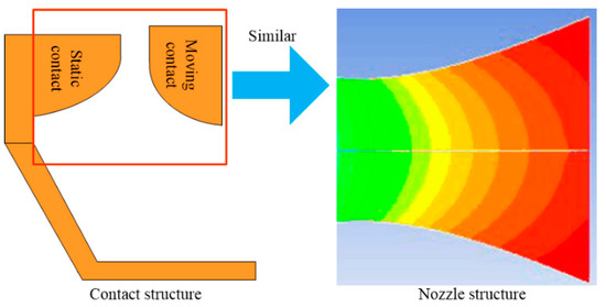 For the DC arc, the improved contact structure is shown in Figure 15. The contact structure is similar to the nozzle structure. In the nozzle structure, the velocity contour diagram is displayed. It can be seen that the velocity of the airflow field is greatly accelerated through the nozzle structure [27].
