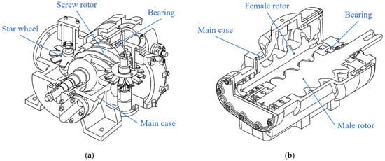 The increase in both global energy demand and environmental concerns has become the growing threat for the survival and development of mankind, pointing to the urgent need for achieving carbon peak and carbon neutrality [1]. One of the significant approaches is to improve the energy efficiency of the energy-using equipment, and the high demands on the energy efficiency can be found in regulations of EU [2], USA [3], China [4], etc. Due to the widespread use and high-power consumption of positive displacement compressors and expanders, a small improvement in the efficiency has a considerable impact on total energy use, which would contribute to decarbonization. Among them, screw machines have outstanding features and thus are widely used in small- and medium-scale gas compression and expansion applications. Screw machines mainly include the single-screw type and twin-screw type, whose typical structures are shown in Figure 1. Twin-screw machines have occupied a large market share in industrial positive displacement machines due to their high reliability, high efficiency, easy operation, well adaptability, and low maintenance costs [5]. Meanwhile, single-screw machines have exhibited sustained growth of market share in several applications because of the balanced loading of the main screw, high volumetric efficiency, low noise, and low vibration [6]. Considering the different applications of gas compression and expansion, there are four kinds of screw machines: twin-screw compressor (TSC), twin-screw expander (TSE), single-screw compressor (SSC), and single-screw expander (SSE).