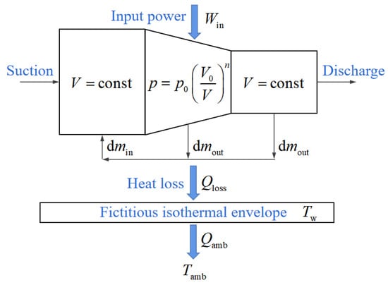 The empirical model doesn’t describe the thermodynamic process but characterizes the machine performance through its isentropic and volumetric efficiencies by means of constant empirical values or polynomial regressions. The semi-empirical model describes the most influential phenomena by a limited number of physically meaningful equations, and correlates the important running conditions as well as design parameters of machines while other unimportant parameters are ignored, as Figure 3 shows. The empirical model and semi-empirical model have fast calculation speed and enough accuracy if verified by experiments, and thus are extensively used for system simulation, machine selection, and operation control. Krichel and Sawodny [47] applied an empirical model with the real polytropic coefficient of an oil-injected TSC into an air compressor block, in order to study the dynamics performance of the compressor. Liu et al. [48] developed a semi-empirical model of a TSC for refrigeration system simulation considering vapor injection and part-load conditions. Giuffrida [49] also proposed a semi-empirical model of an open-drive refrigeration TSC, but did not consider the presence of the lubricating oil. Later, Giuffrida [50] again revised a semi-empirical model of a SSE with particular attention paid to the mechanical losses at the shaft and the ambient heat losses.