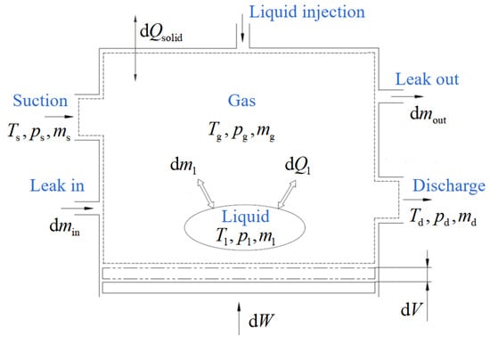 As shown in Figure 4, the lump model is to describe thermophysical properties of fluids in the control volume in terms of rotating angle by developing differential control equations based on mass and energy conservation. Usually, there are two options of the lump model: m-u model [55,56,57,58,59] and p-T model [17,29,60,61,62,63]. The former is simpler in equation structures, while the latter consumes less time. Furthermore, the equations describing leakage, heat transfer, and thermophysical properties of working fluids are also needed to finish the calculation.