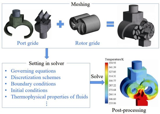 CFD is a powerful technology in many engineering fields, and has an increased tendency in applying to twin-screw machines. The application of CFD technologies to twin-screw machines involves unsteady flow with moving boundaries, so the high-quality grids are required to represent the highly deforming working chamber for transient simulations. As shown in Figure 5, meshing the flow field is the primary procedure in CFD modelling of screw machines, while the complex rotor shape and very small gaps in screw machines make the grid generation of the rotor filed very difficult. Researchers from City University London made significant efforts into the rotor grid generation for twin-screw machines by means of algebraic methods [33,70,71,72], and have implemented it into the custom-made program called SCORG. The special rotor grid generator for rotary positive displacement machines, TwinMesh, also purposely contains the module for twin-screw machines, but can only be used in the CFD solver, ANSYS CFX. As a case, Wu et al. [73,74] applied the TwinMesh to generate the rotor grid for a refrigeration TSC. Additionally, some common commercial software, such as Gambit [75] and STAR-CCM+ [76], can also be used to generate dynamic grids for twin-screw machines, but are hardly used owing to the inconvenience.