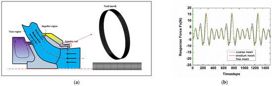 In this paper, the ANSYS ICEM CFD commercial software was employed to generate the full 3-D seal structured mesh for calculation because of the nonuniform response forces inside the annular seal. For the sake of investigating grid independence and how fine the structured mesh density is required for precisely predicting the rotordynamic characteristics, three types of mesh (coarse, medium and fine) were created. The number of nodes for the coarse mesh is 1.25 × 106 with 1.15 × 106 elements, while the size of the medium mesh and fine mesh is 2.31 × 106 nodes with 2.16 × 106 elements and 3.21 × 106 nodes with 3.13 × 106 elements, respectively. As shown in Figure 2b and in Table 2, there is a slight difference between the response force, inlet mass flow and total outlet pressure of the medium and fine meshes. Hence, the medium mesh was adopted for the following numerical investigation. The numerical parameter settings in detail are provided in Table 3.