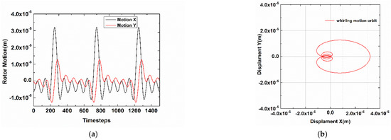 (a) Monitors of rotor motion (x-direction excitation); (b) Displacement of multiple-frequency whirling orbit modal (x-direction excitation).