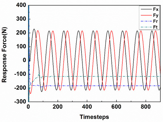 Based on the small motion theory, ignoring the added mass terms, the fluid-induced forces can be defined by the response force/seal motion model [28], as presented in Equation (3), which generates the relationship between the reaction-force and the rotor motion through direct force coefficients (,,,) and cross-coupled force coefficients (,,,).
