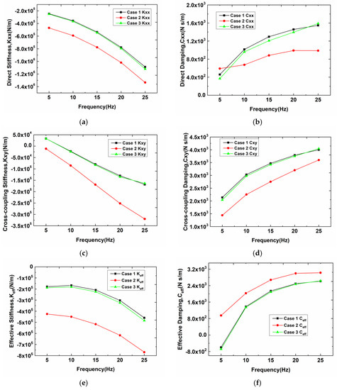 Direct stiffness Kxx (a), direct damping Cxx (b), cross-coupling stiffness Kxy (c), cross-coupling damping Cxy (d), effective stiffness Keff (e) and effective damping Ceff (f) of the annular seal in Case 2 (impeller blades number m = 5).