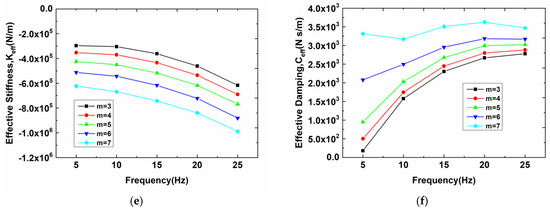 Figure 11 depicts the predicted rotordynamic coefficients with five different blade numbers for the annular seal in Case 2. It is observed that there is an obvious trend of direct stiffness , cross-coupling stiffness , effective stiffness and effective damping versus impeller blade number m. The stiffness coefficients decrease with the increase of impeller blade number m, while the effective damping increases. For each impeller blade number, the stiffness coefficients decrease with the increasing whirling frequency, while the effective damping increases. Compared to the evident trend of the stiffness coefficients versus whirling frequency and impeller blade number, Figure 11b,d,f shows a more complex trend of the damping coefficients. As shown in Figure 11b, the direct damping increases with the increasing whirling frequency when the impeller blade number m is below 5. However, with the impeller blade number increased above m = 5, the direct damping gives gentle variation versus whirling frequency, which begins to show a trend independent of the whirling frequency. At the frequency of 25 Hz, the direct damping decreases with the increasing impeller blade number m, while at the frequencies smaller than 25 Hz, the increasing blade number has a significant effect on the chaotic variation trend, especially at 5 Hz. Figure 11d gives the dependence of rotordynamic coefficients versus whirling frequency for the annular seal. For the frequencies larger than 10 Hz, the cross-coupling damping decreasing with the increasing impeller blade number m presents a steady trend. Compared to these trends shown in Figure 11b, the results of effective damping in Figure 11f present a more obvious trend: it is independent of the whirling frequency when blade number m = 7.