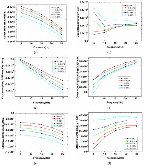 (a) Direct stiffness Kxx, (b) direct damping Cxx, (c) cross-coupling stiffness Kxy, (d) cross-coupling damping Cxy, (e) effective stiffness Keff and (f) effective damping Ceff of the annular seal with impeller blades number m = 5.